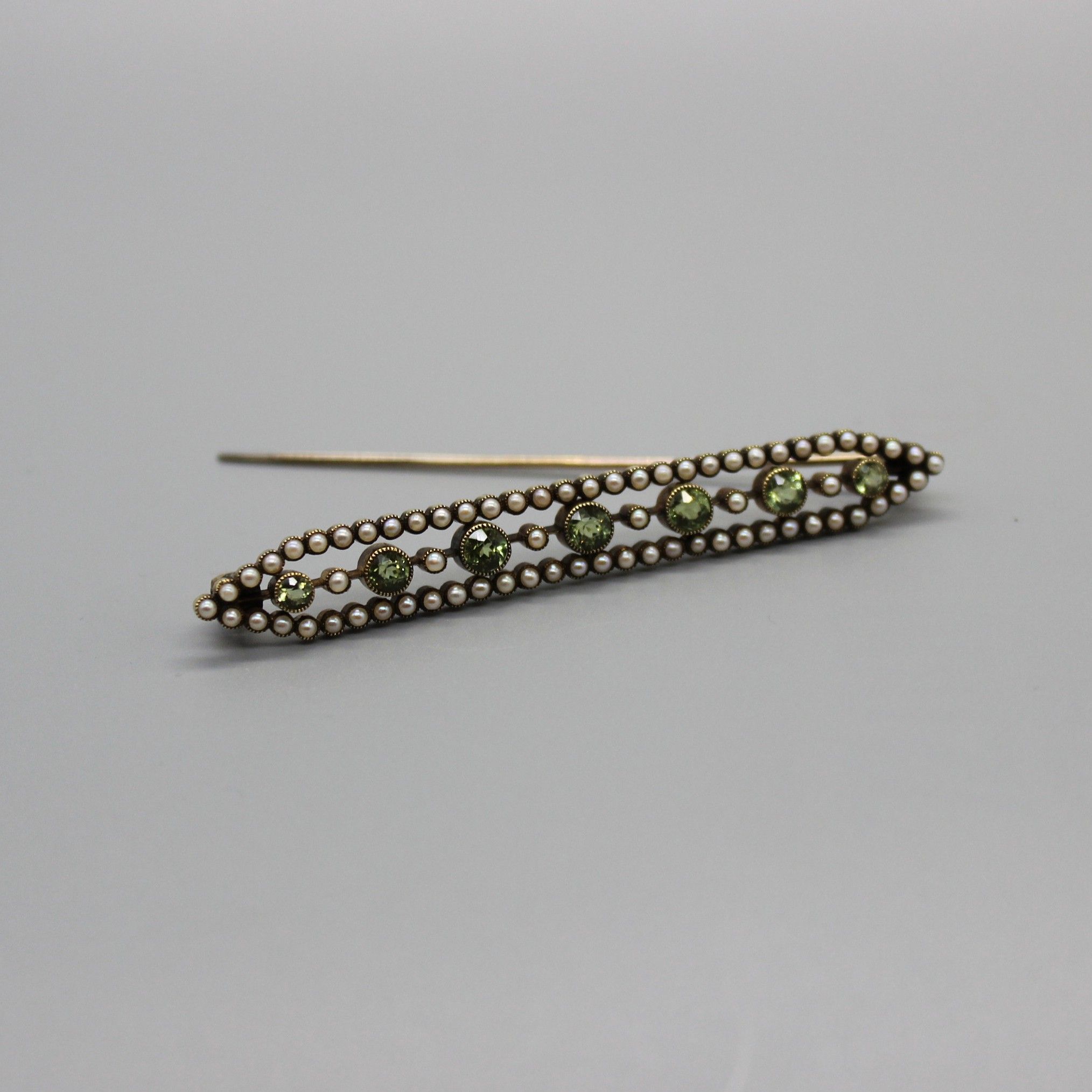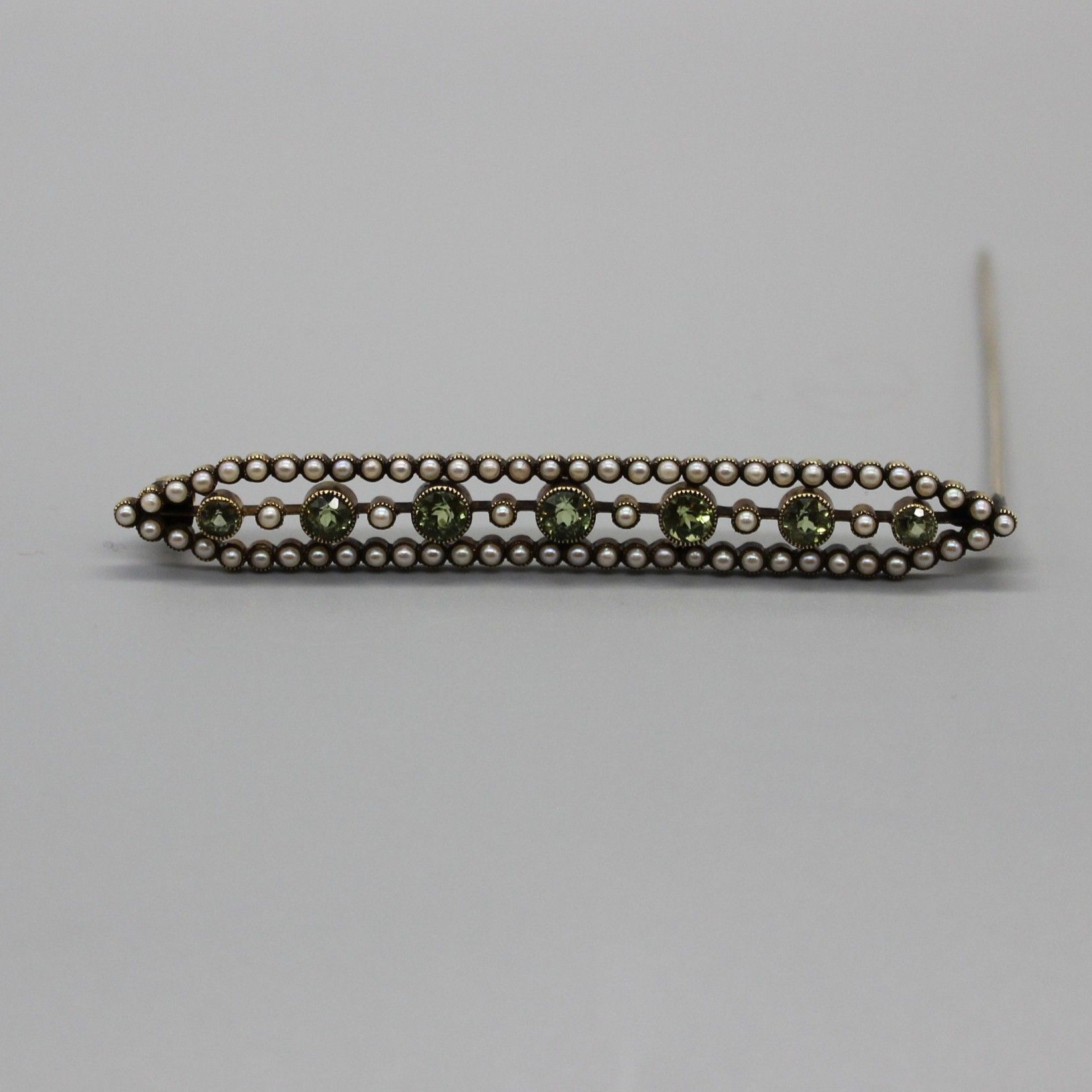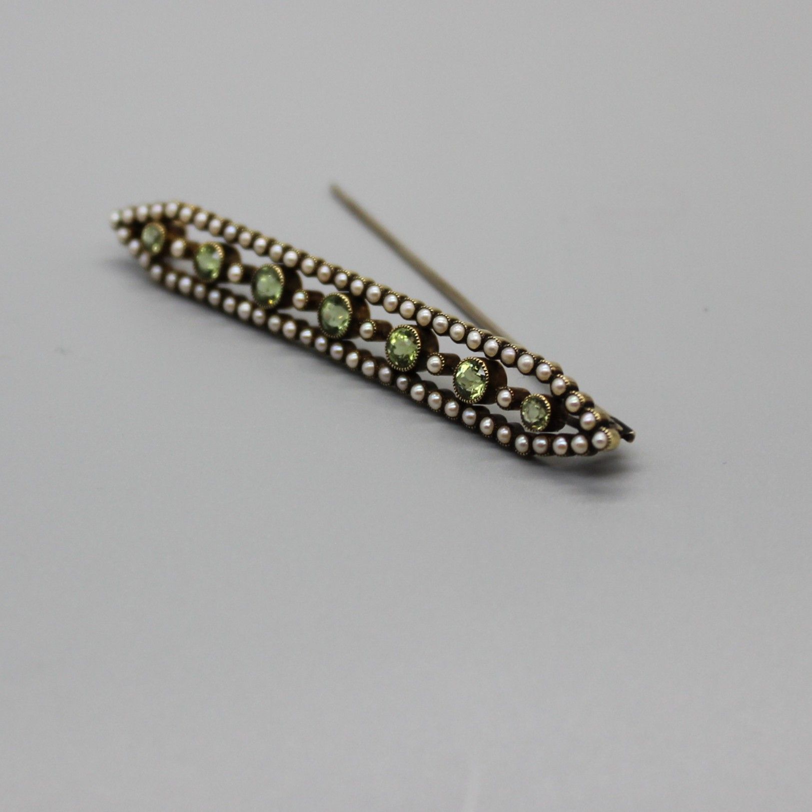 | 備考 | パールがペリドットを取り囲む端正なバーブローチ 中央のバーは正面からは殆ど見えないため、まるでペリドットが浮いているようです アンティークジュエリーの良さが詰まった美しいジュエリー |