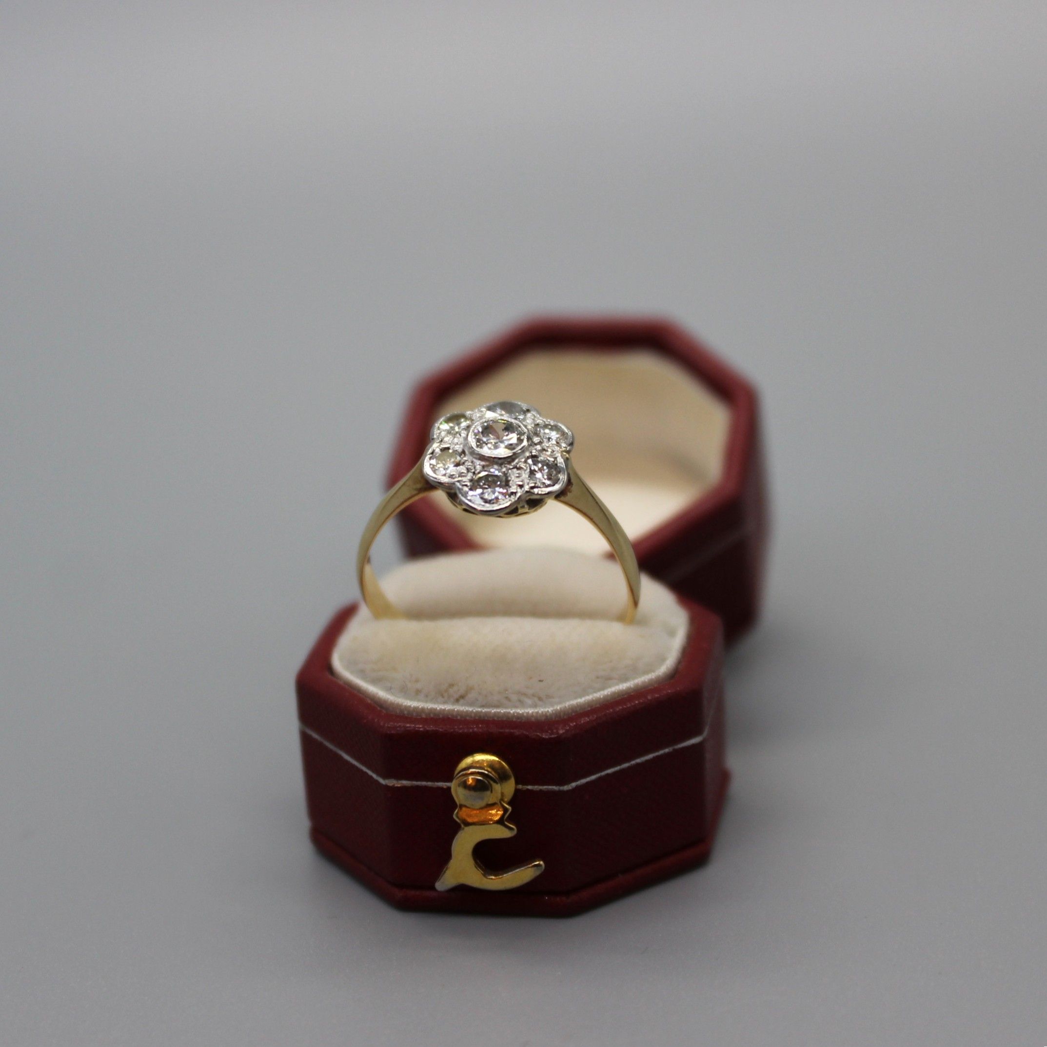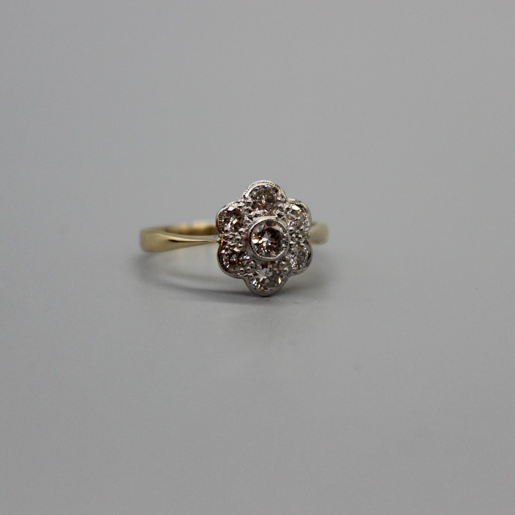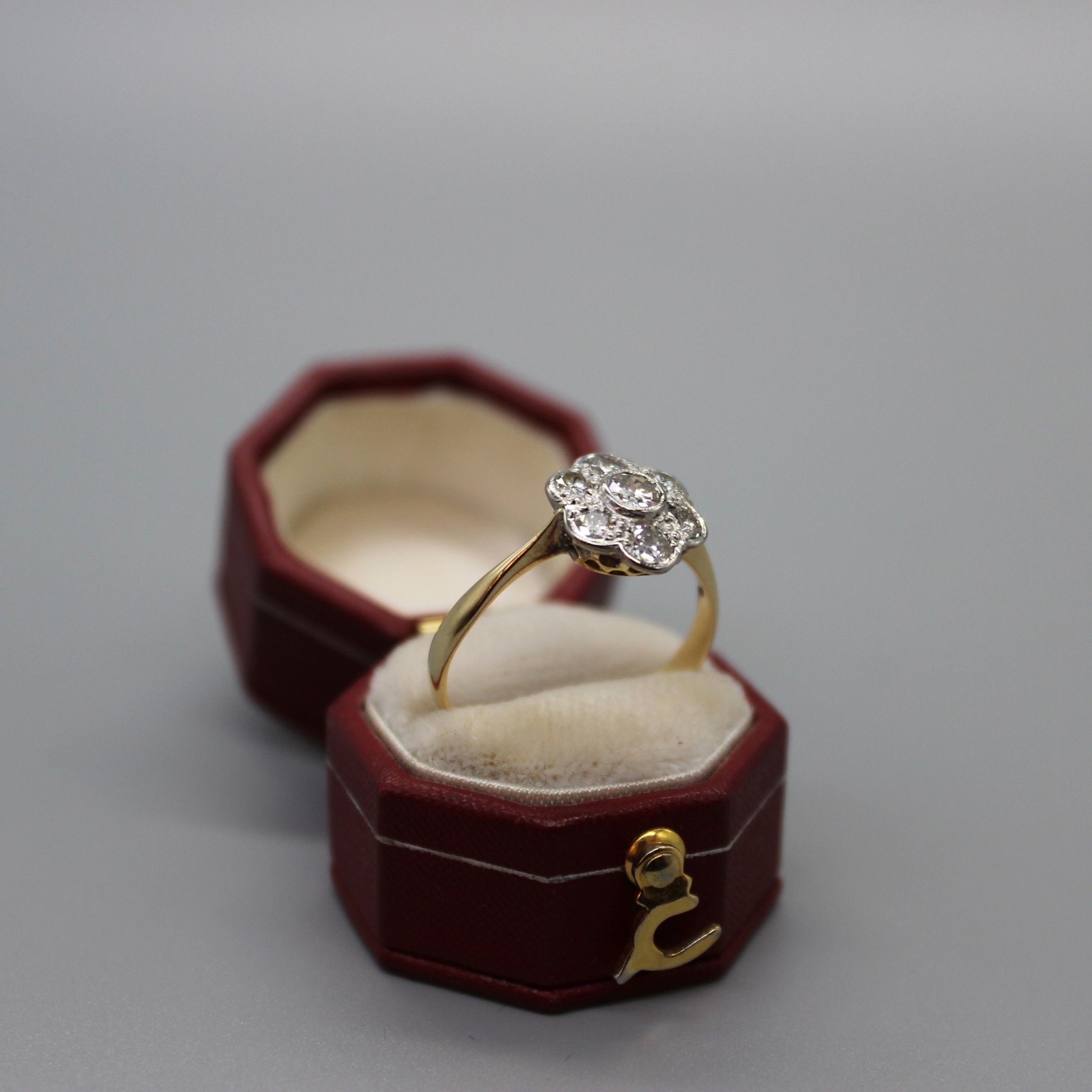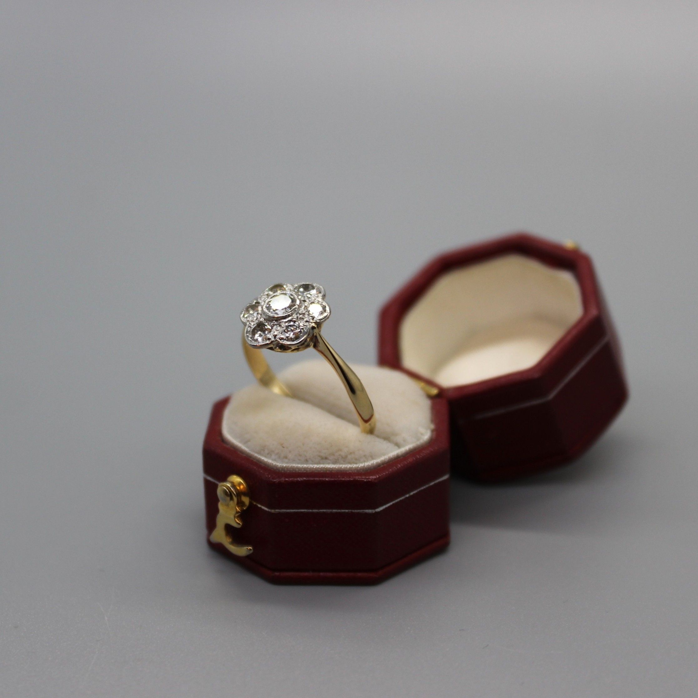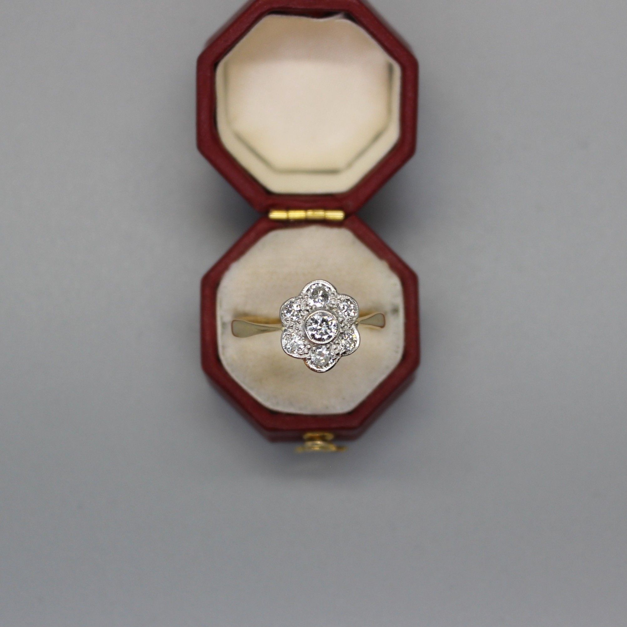 | 備考 | アンティークジュエリーの定番ともいえるクラスターリング 当時最先端のラウンドブリリアントカットのダイヤを使用しています ダイヤの周囲にミル打ちを施す丁寧な作りが見られるのはおおよそこの時代まで ダイヤの強い輝きと枠の綺麗さが合致した素敵なリングです |